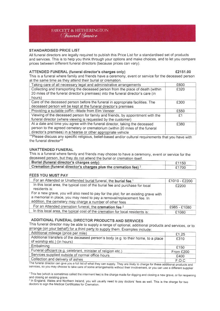 Here at Fawcett and Hetherington Funeral Service we are transparent with our prices and want to make sure that you can see this too.Below is a copy of the standardised price list (and our small funeral packages) which is legally required by law to be shown by every UK funeral director from September 16th 2021, if you have any questions or need any help please contact us on 01642 459555. If you would like a copy of this please email us on info@fawcettandhetherington.co.uk where we will send you a PDF version.Prices current from September 2025